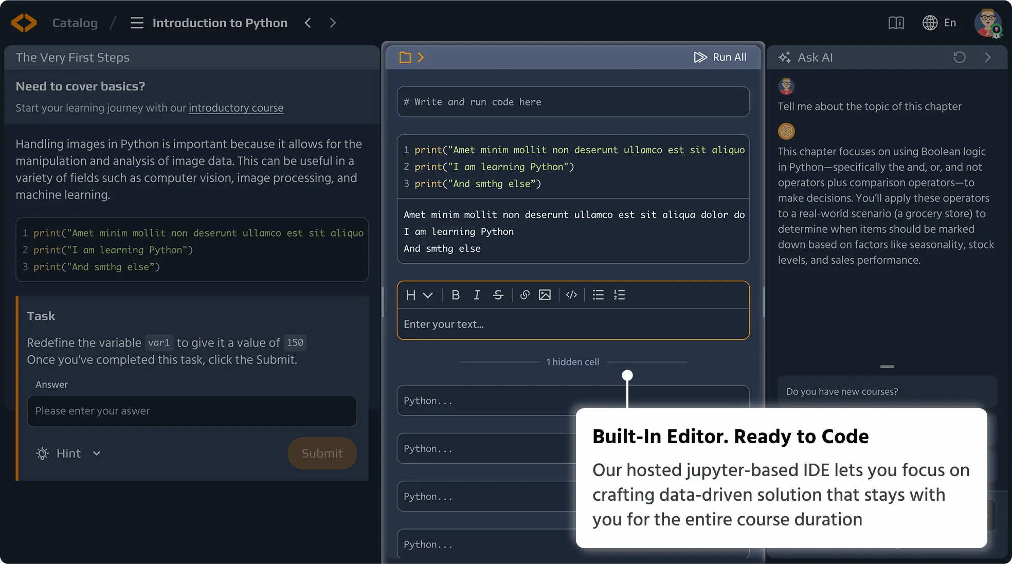 Welcome to the Python Ninja Course! This engaging and interactive course is designed to introduce you to the fundamentals of Python programming through a fun and educational game. You'll guide a ninja through various challenges, using Python to control movements and interact with objects like sushi. Starting with the basics, you'll learn how to navigate the map, pick up and place sushi, and gradually progress to more complex programming concepts such as functions, loops, and conditional statements. Each chapter offers hands-on practice to reinforce your learning, culminating in exciting challenges that test your skills. Whether you're a complete beginner or looking to sharpen your coding abilities, this course provides a comprehensive and enjoyable learning experience. Join us and become a coding ninja!