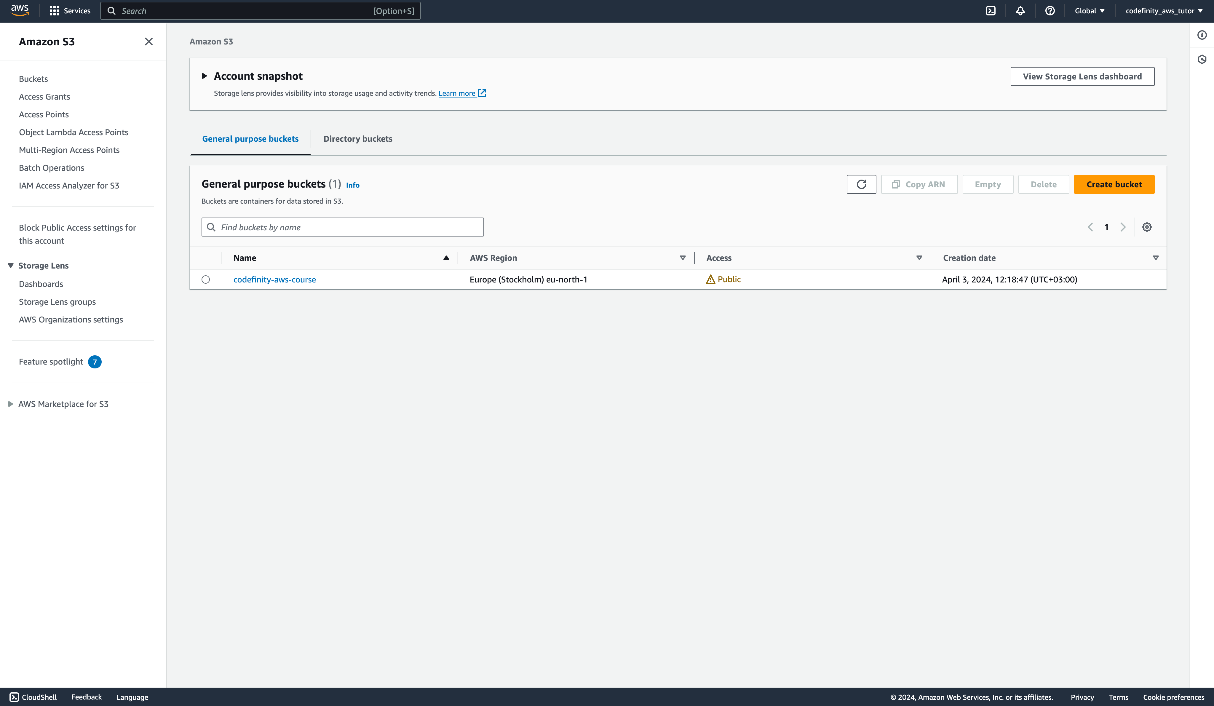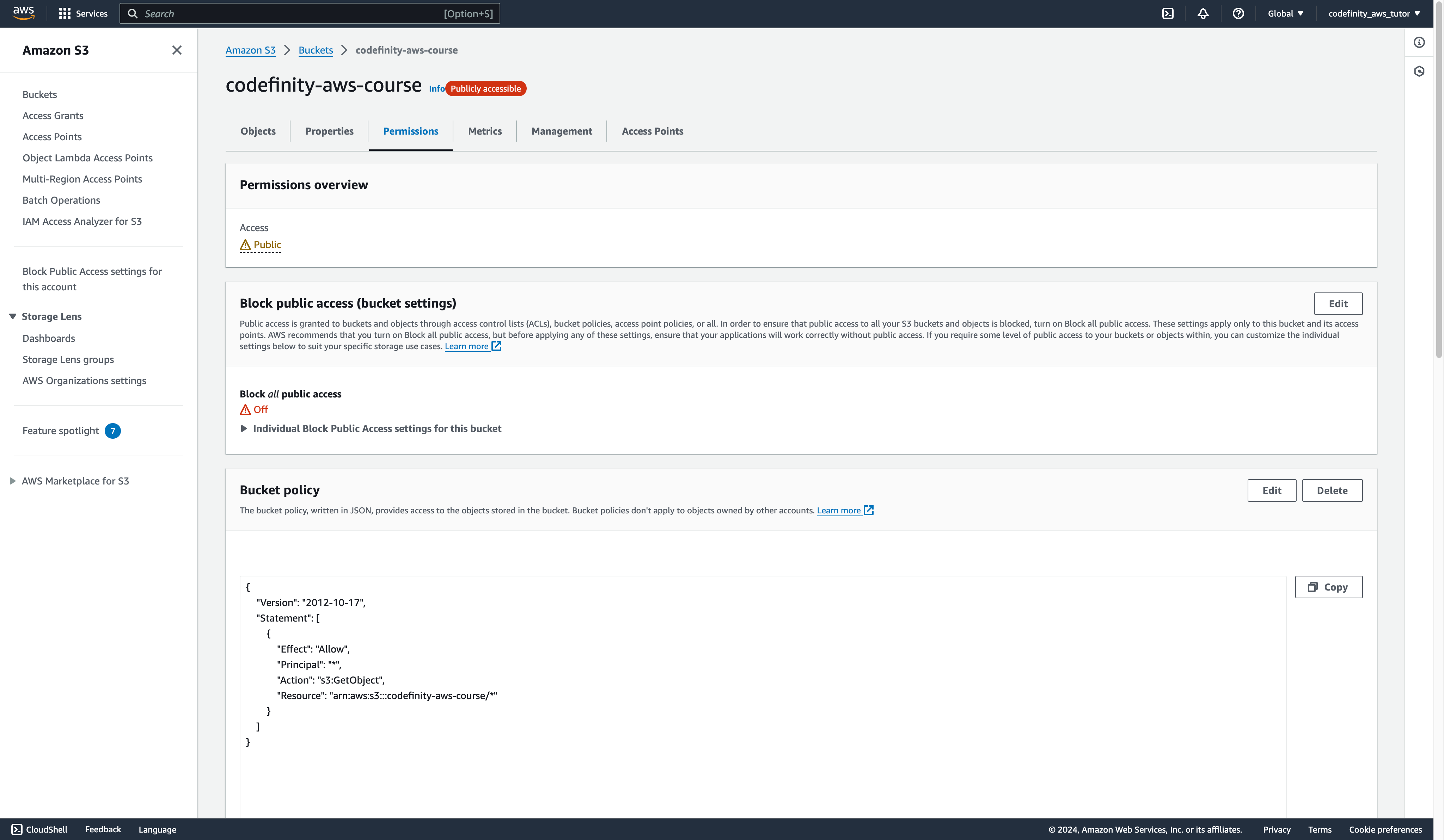 Disregard any warnings from AWS as this is a learning exercise. The files in the bucket need to be public so we can clearly observe how storage operates through the code.