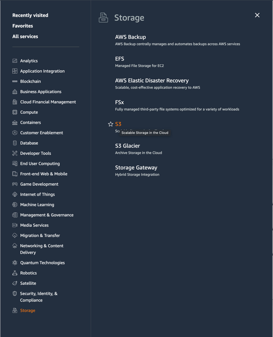 Now, let's begin working with S3. First, we need to access the service by clicking on the "Services" button in the top left corner. Then, at the bottom, you'll find the "Storage" section. After clicking on it, a menu will appear where you should select S3: