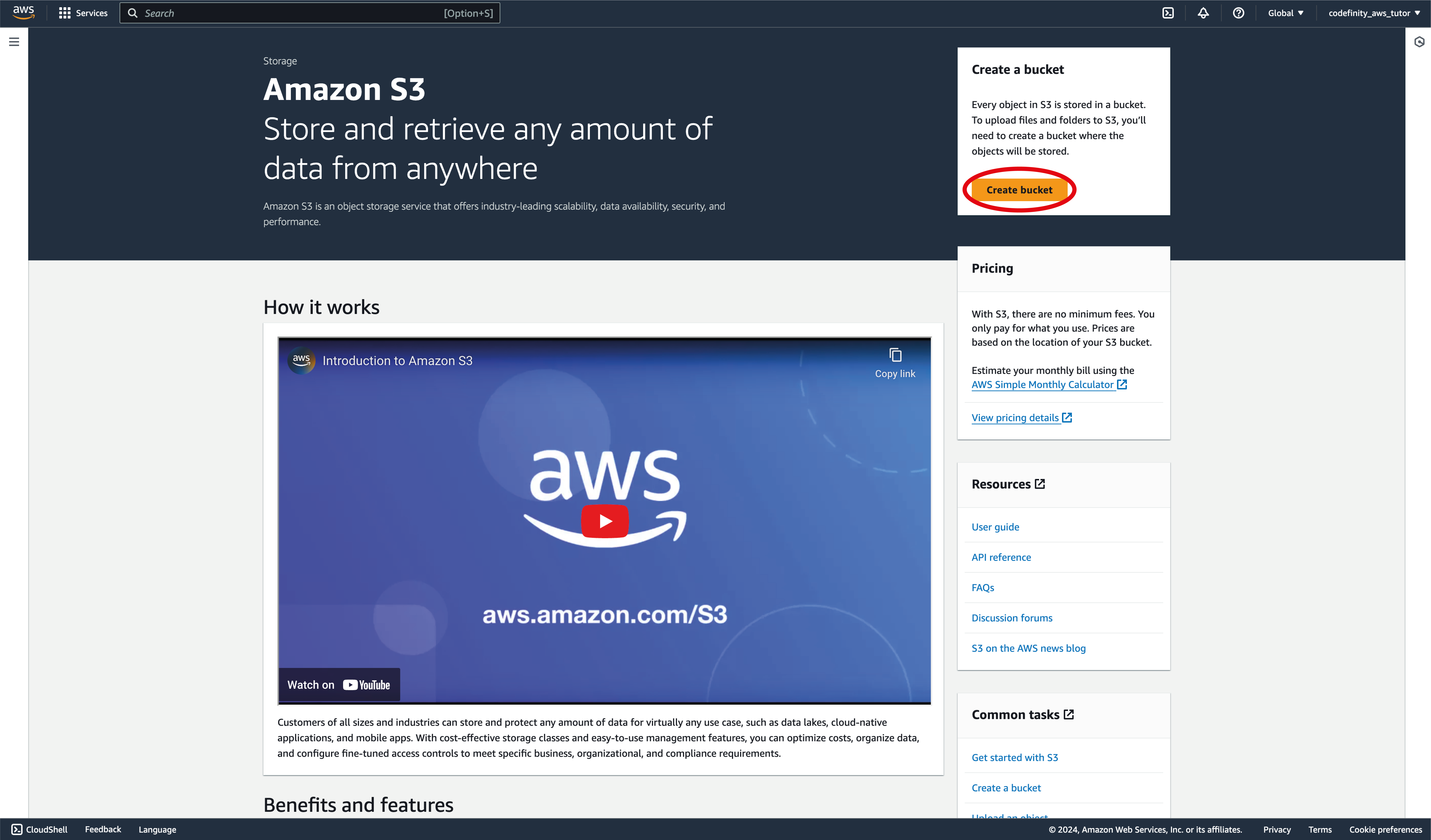 After that, we'll navigate to the menu where you can see a short video guide from Amazon, which will explain how to work with S3, along with a lot of other helpful information. You can watch it if you like, but right now, what we need is the "Create Bucket" button, which is shown in the screenshot below: