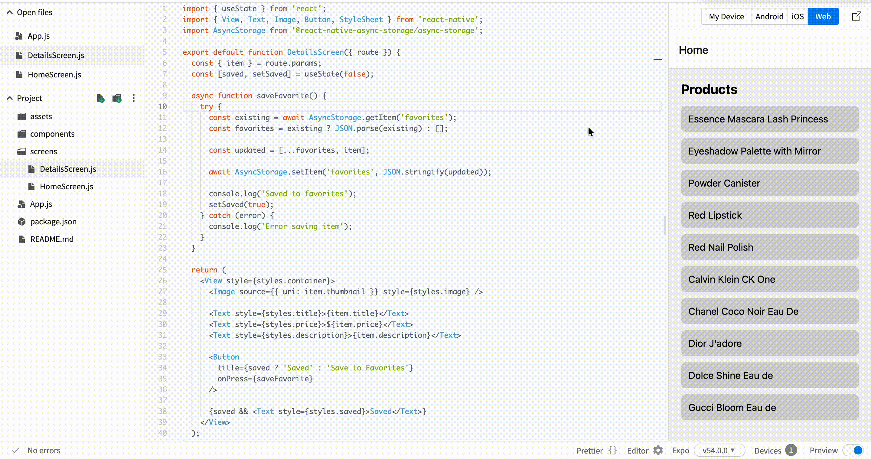 Now we want to let users save items. This is a common feature in real apps. Users often want to keep items and access them later.
