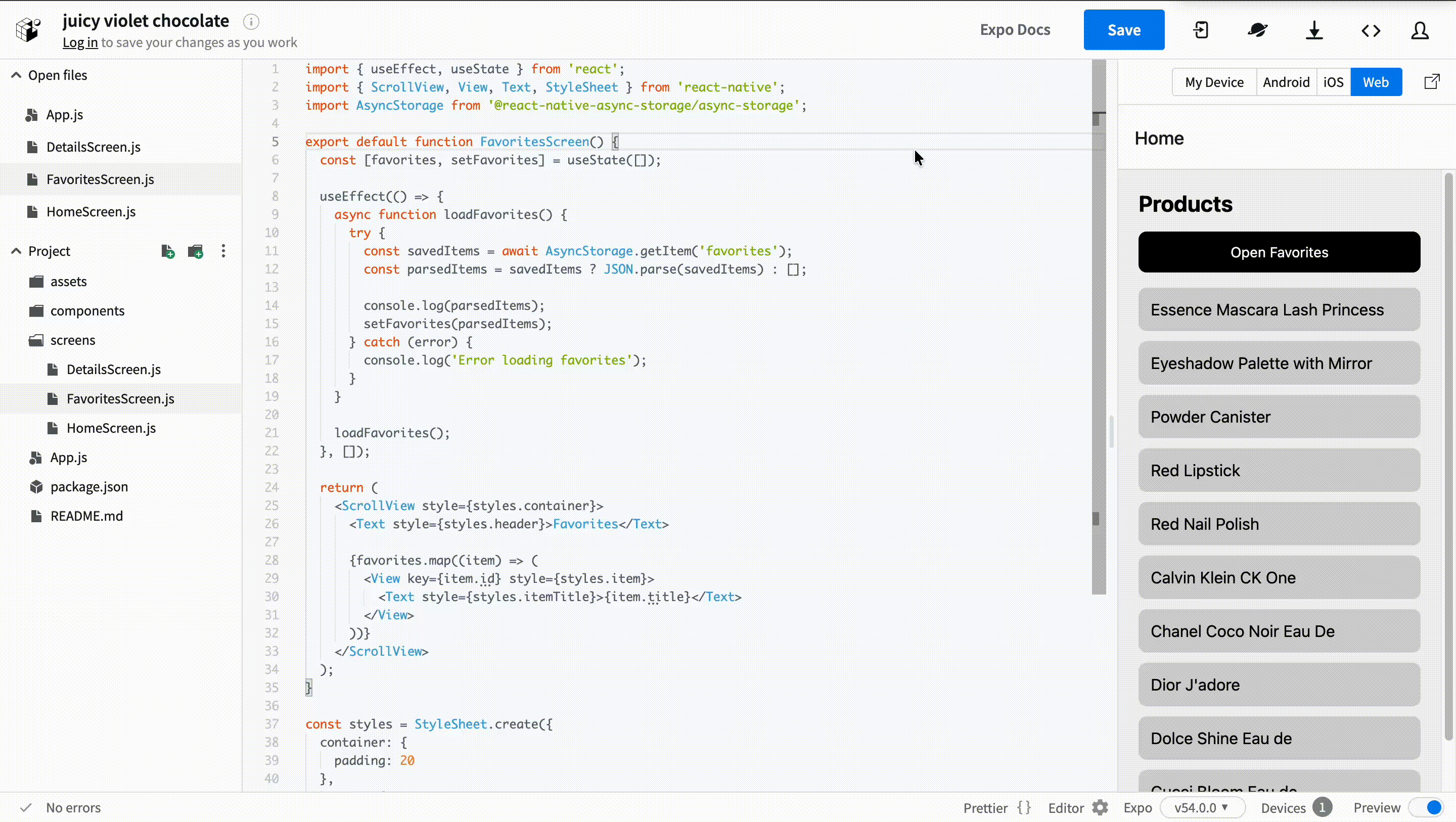Now we want to display the items saved by the user. Saving data is only half of the feature. Users also need a way to see what they saved. At this stage, the simplest solution is to add a new screen for favorites.