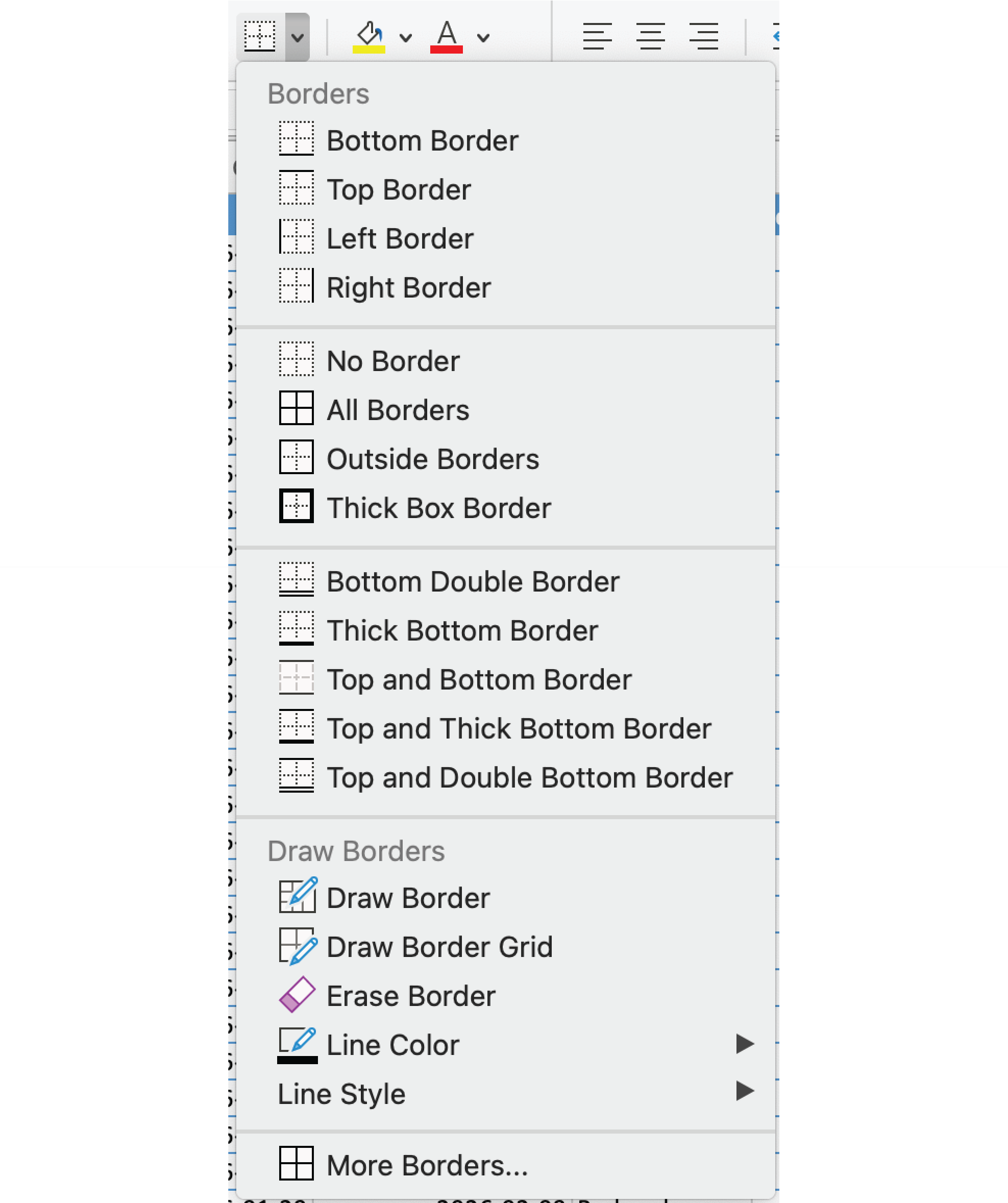 - Flere kanter: åbner dialogboksen Formater celler. Anvend kanter side om side, vælg brugerdefinerede linjetyper og farver, eller fjern bestemte kanter individuelt;