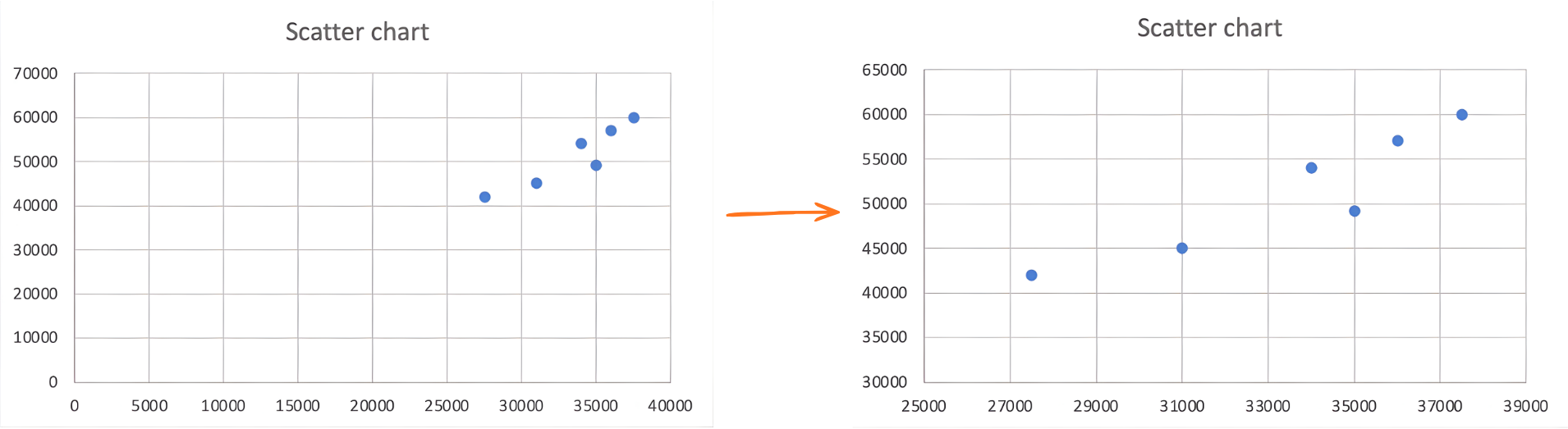 Højreklik på aksen → Formater akse → Aksindstillinger → indstil Minimum til den laveste dataværdi i dit område (f.eks. 27 500) og Maksimum til den højeste (f.eks. 60 000). Klik på talfeltet og indtast værdien — brug ikke pilene til store tal.