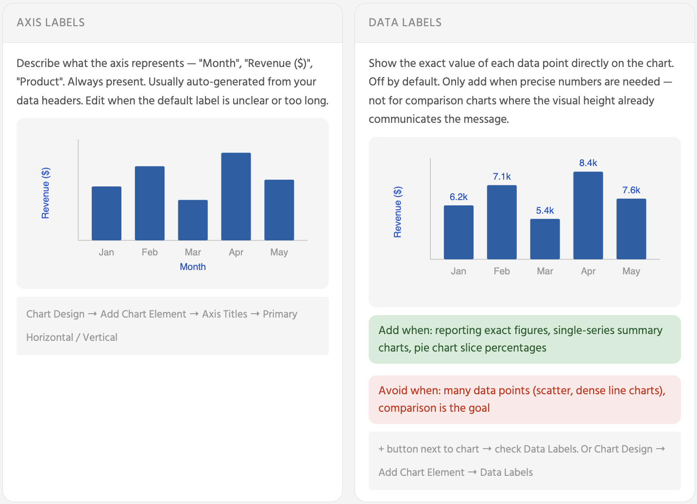 Aksel-etiketter beskriver, hvad aksen repræsenterer — de er altid til stede og behøver sjældent at blive ændret. Dataetiketter viser den præcise numeriske værdi for hver søjle, datapunkt eller lagkageskive — de er som standard slået fra og bør kun aktiveres, når læseren reelt har brug for det nøjagtige tal frem for blot den visuelle sammenligning.