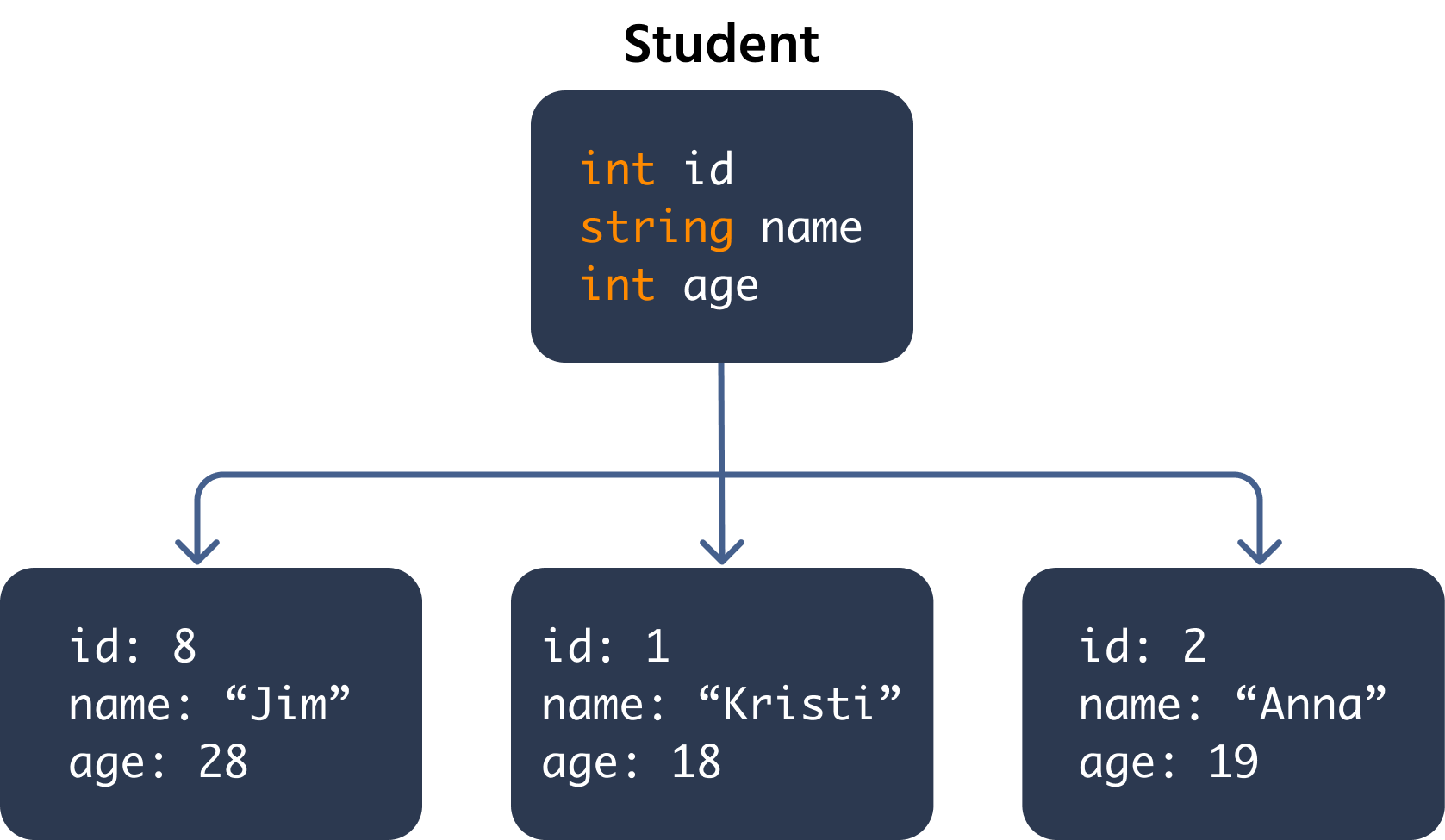 Beim Definieren einer Struct wird eine Blaupause oder ein Format zur Speicherung von Daten festgelegt – daher kann eine Struct selbst keine Daten speichern. Mithilfe der Struct können jedoch Objekte (auch als Instanzen bezeichnet) dieser Struktur erstellt werden, die Daten im durch die Struktur vorgegebenen Format speichern können. Nachfolgend eine Darstellung einer Struct mit ihren Objekten: