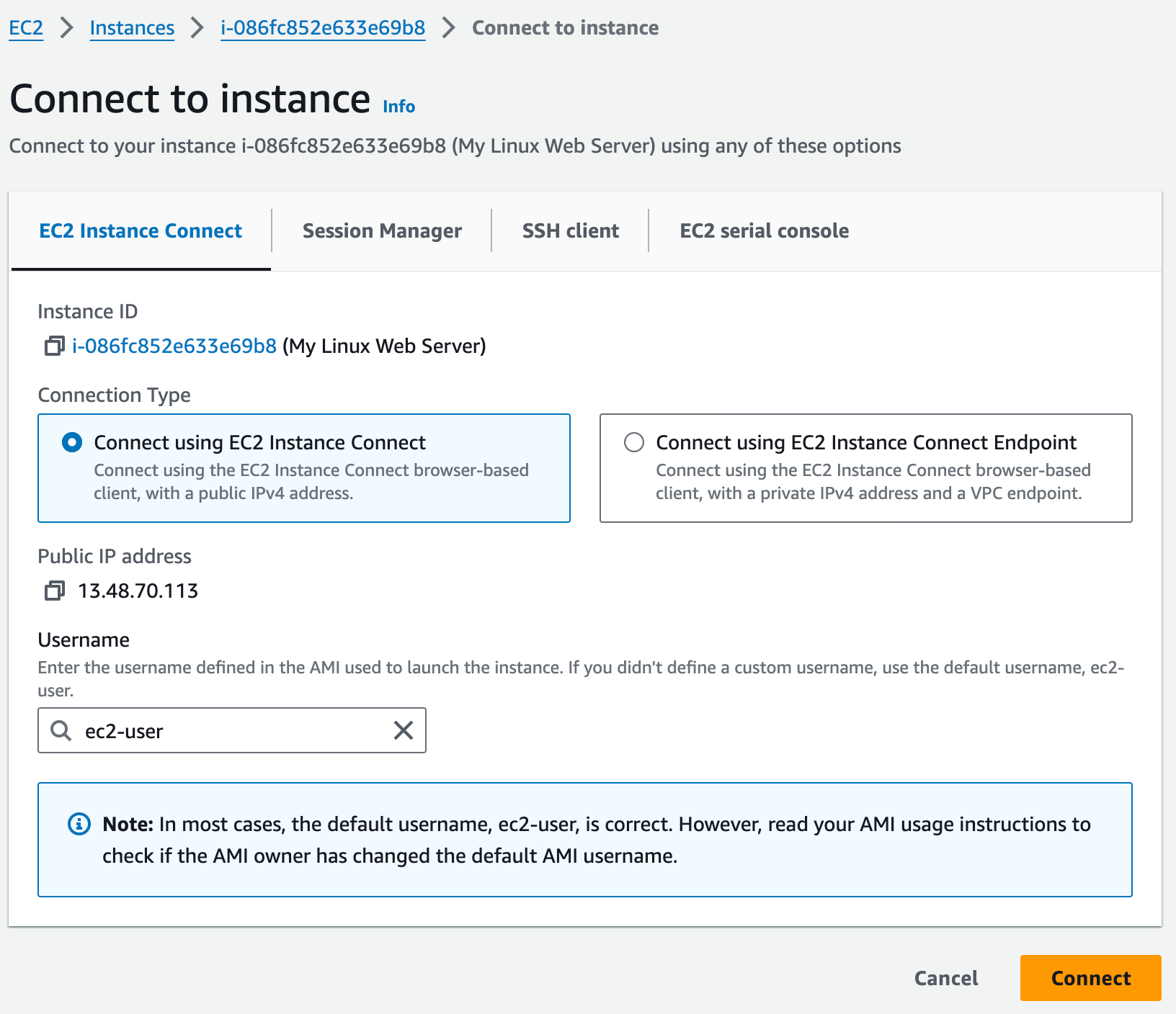Al hacer clic en el botón, será redirigido a un menú con varias opciones de conexión. Seleccione "Connect using EC2 Instance Connect" y luego haga clic en "Connect":