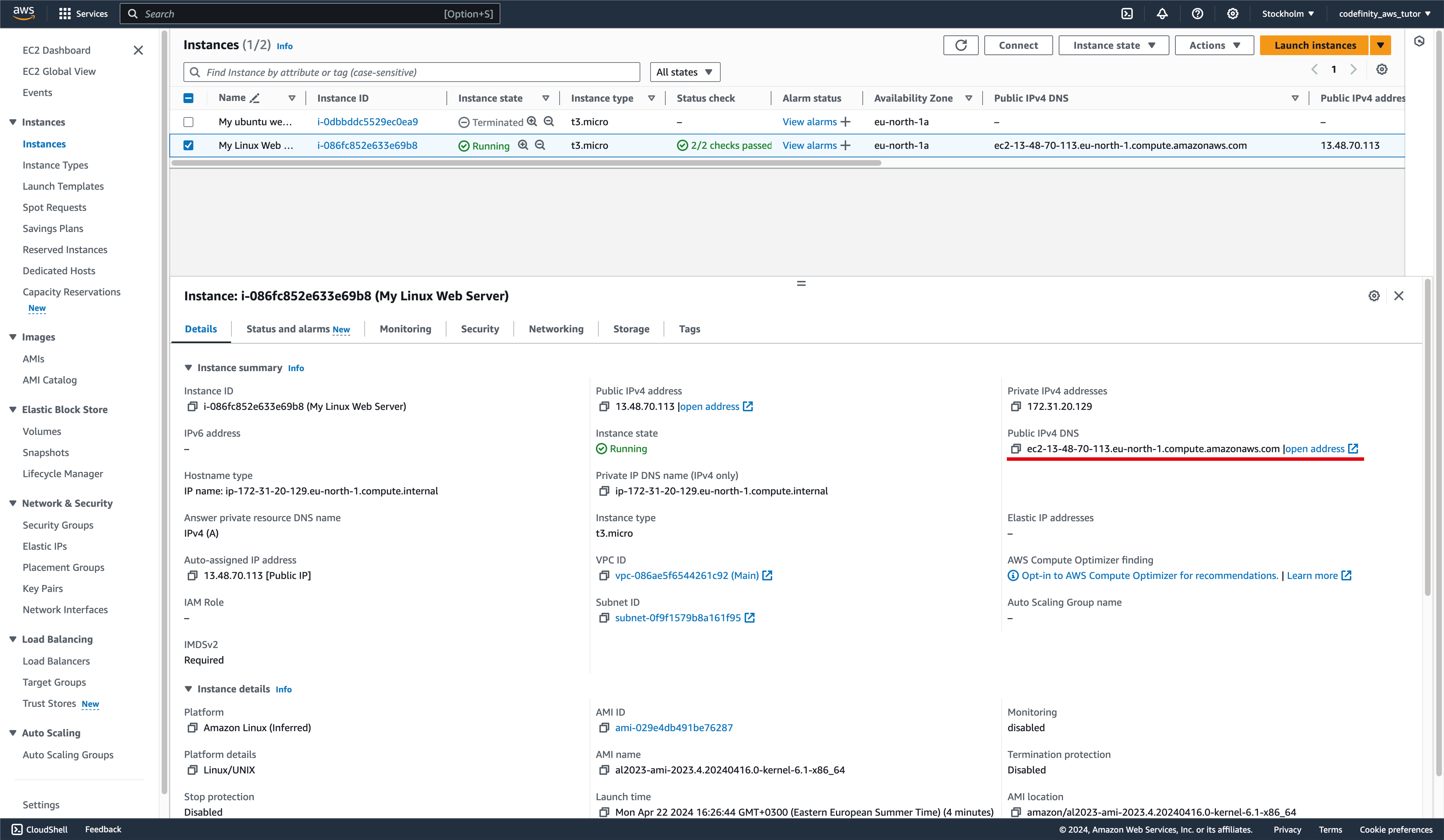 Puedes encontrar el DNS público de tu instancia abriendo la instancia desde tu lista de instancias: