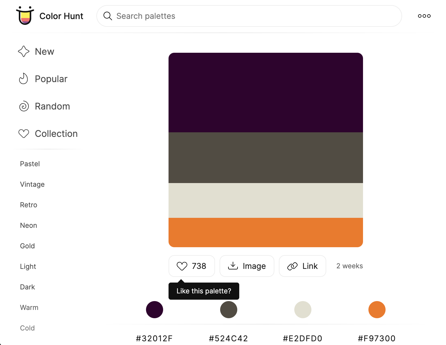 Voimme käyttää seuraavaa lähdettä (https://colorhunt.co/) valitaksemme mieluisimman väripaletin.