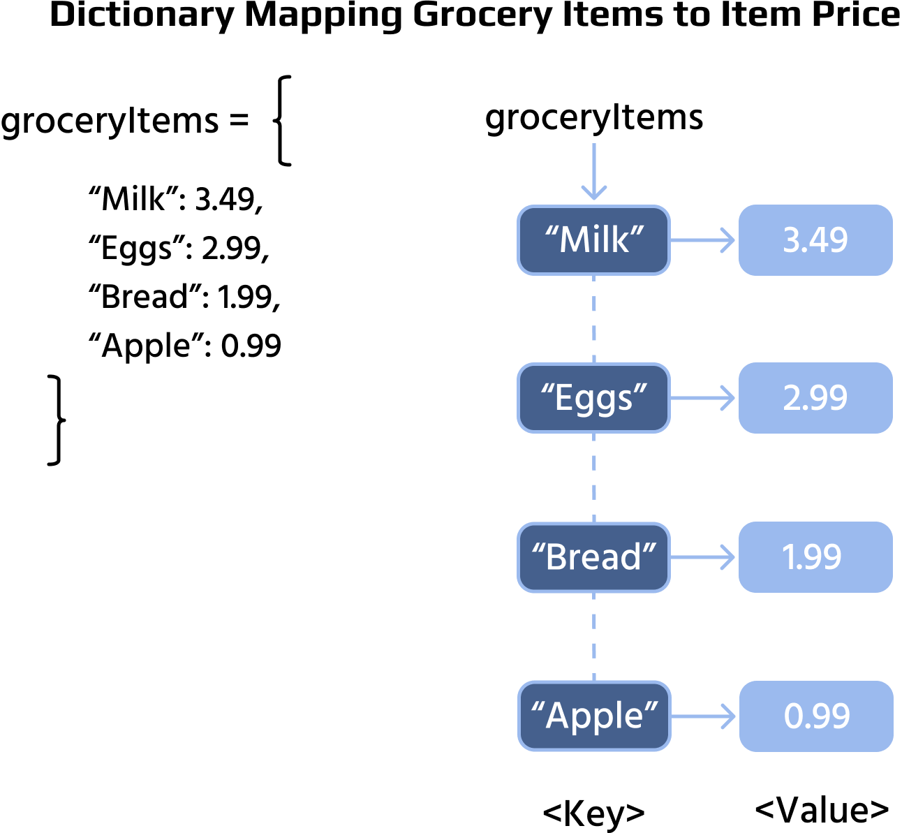 1234567891011# Dictionary creation groceryItems = { "Milk": 3.49, "Eggs": 2.99, "Bread": 1.99, "Apples": 0.99 } # Extracting dictionary elements by their keys print("Price of Milk:", groceryItems["Milk"]) print("Price of Bread:", groceryItems["Bread"])