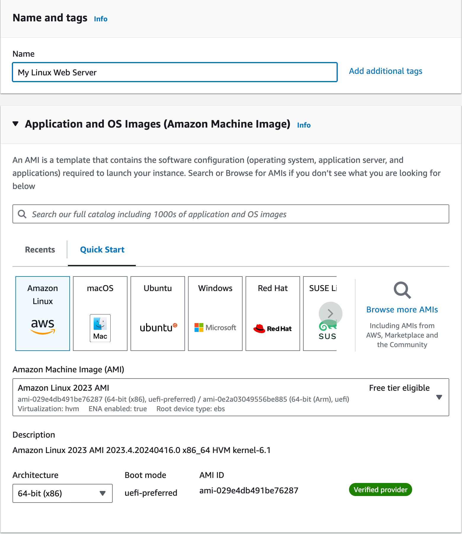 We will be using Amazon Linux, as it is one of the configurations offered in the free tier, which we want to stick to. After selecting it, EC2 notified us that this configuration is available in the free tier: