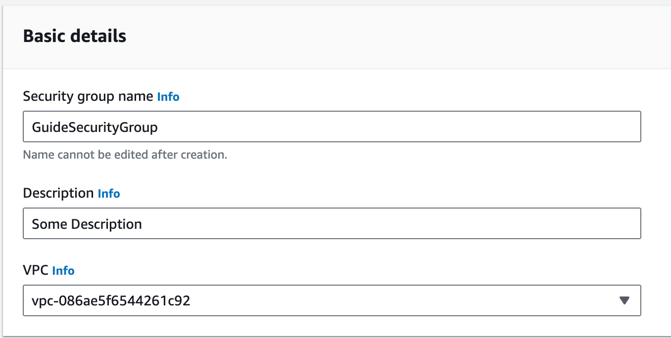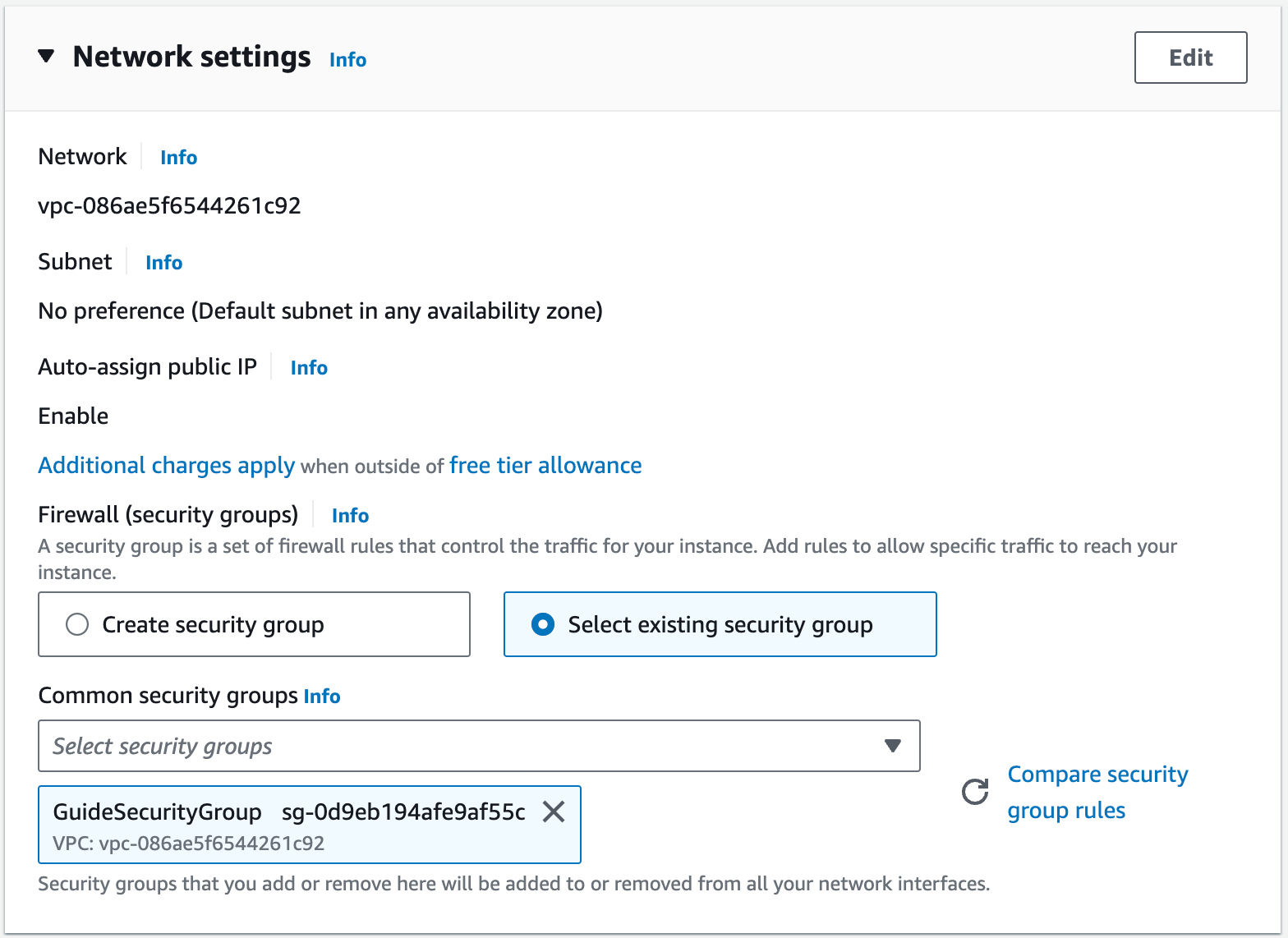- Select existing security group: choose this to use an already created security group. In the example, the "GuideSecurityGroup" is already selected.