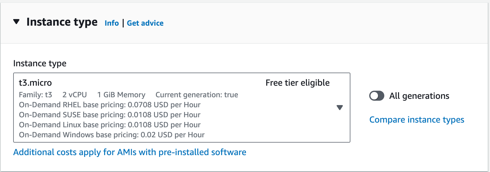 Next, we need to choose the instance type. There are many options available, but the free tier selection is more limited. Therefore, we will go with t3.micro, which is a relatively low-powered server, but it should be sufficient to demonstrate the capabilities of EC2: