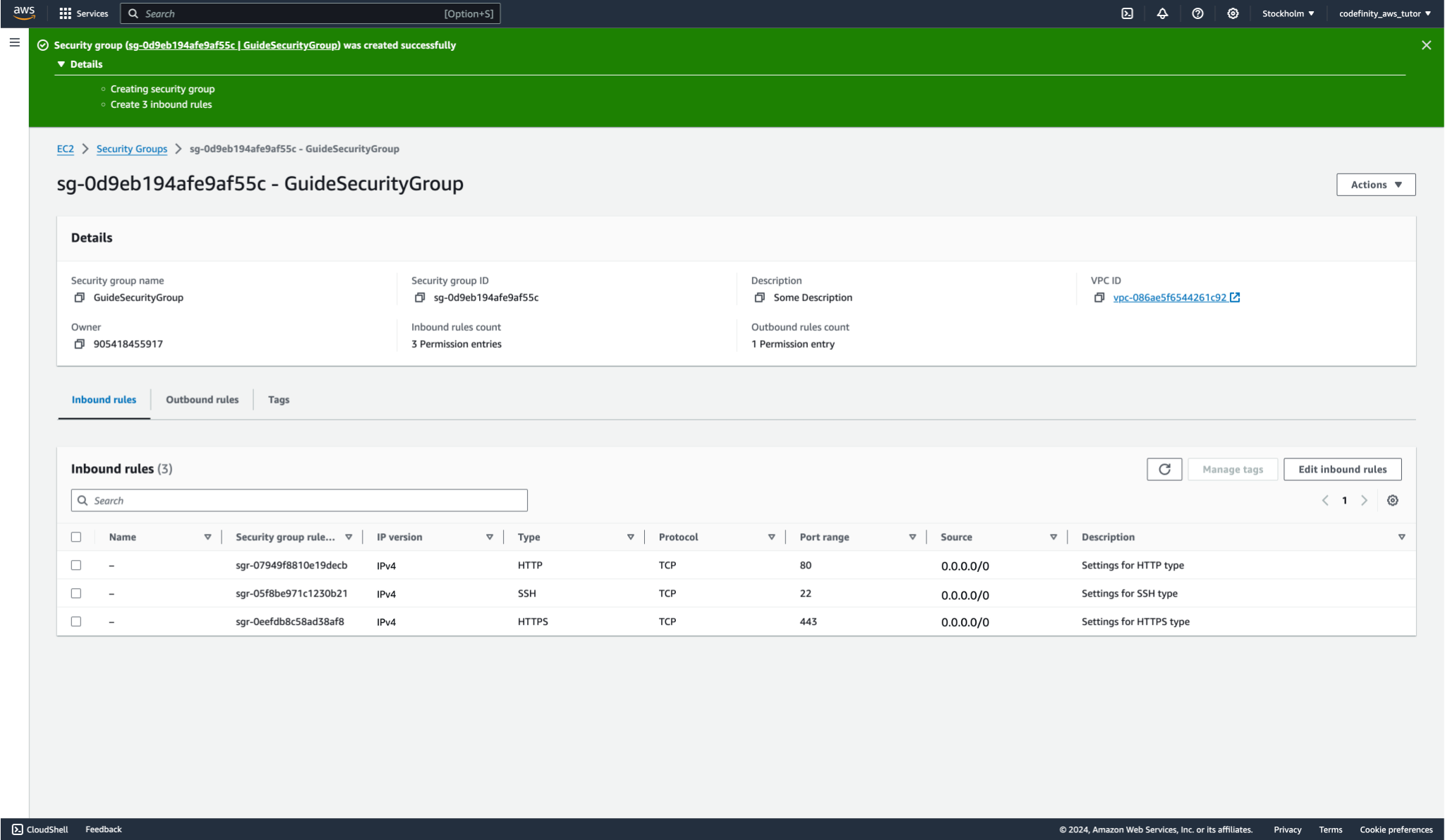 Once you've created the Inbound Rules, you can create the Security Group and get the following result: