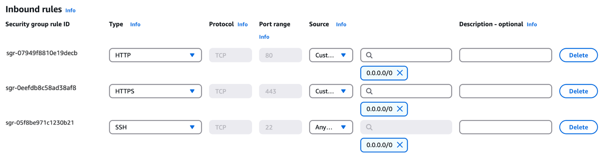 - We need 3 inbound rules: SSH, HTTP, and HTTPS;