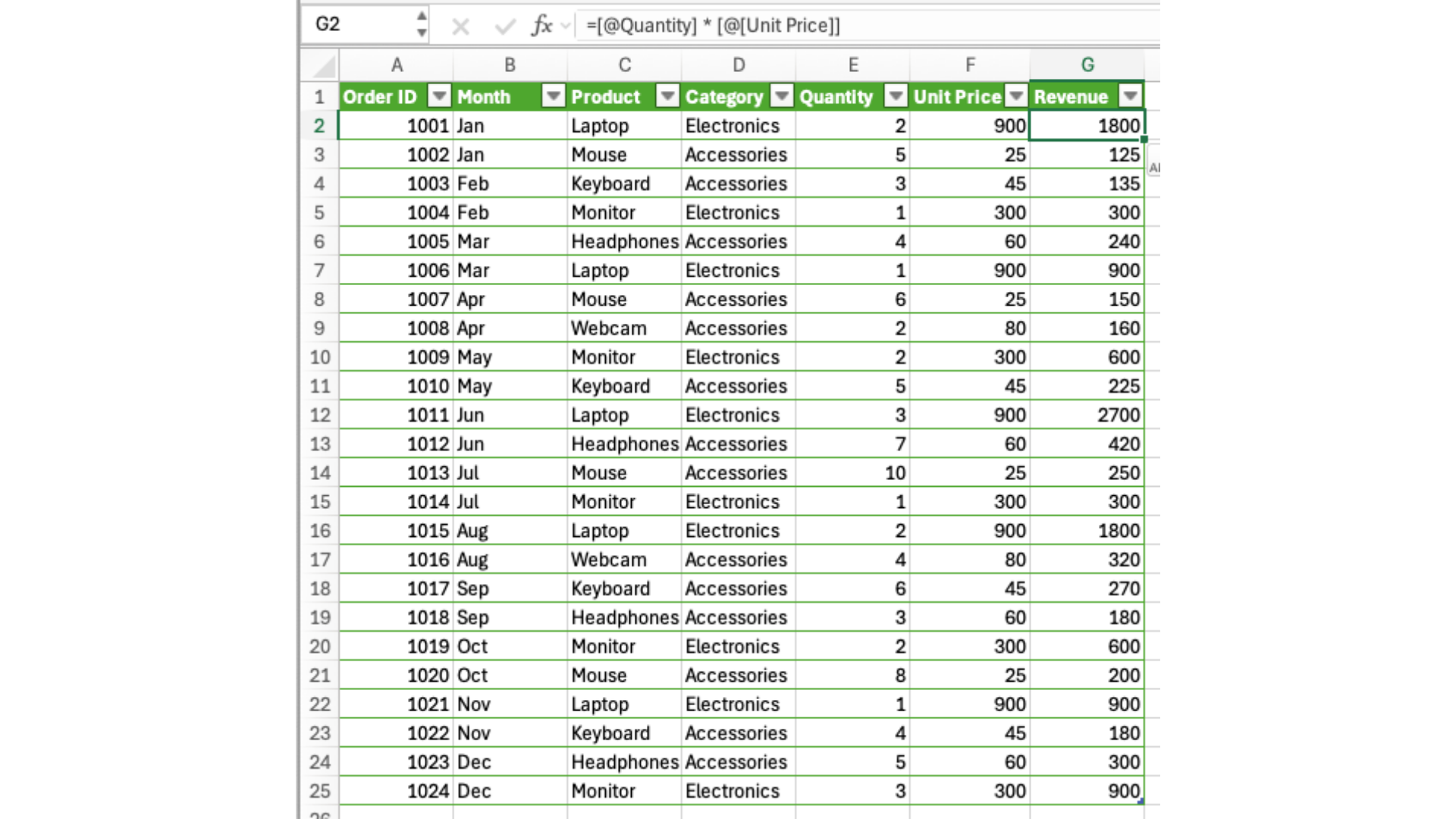 Excel automatically applies the formula to every row in the table. Each row multiplies its own Quantity by its own Unit Price, without referencing fixed cell ranges.